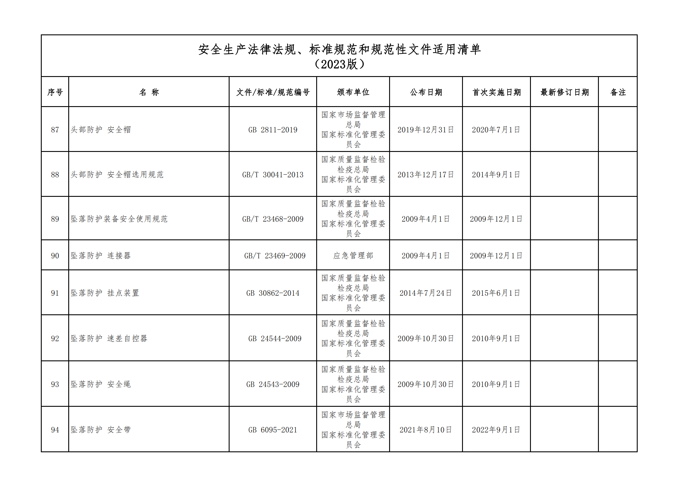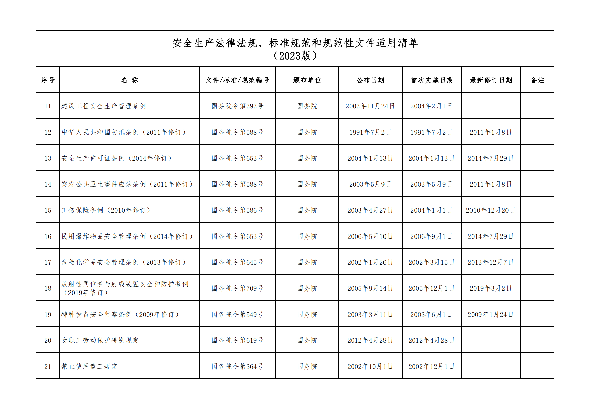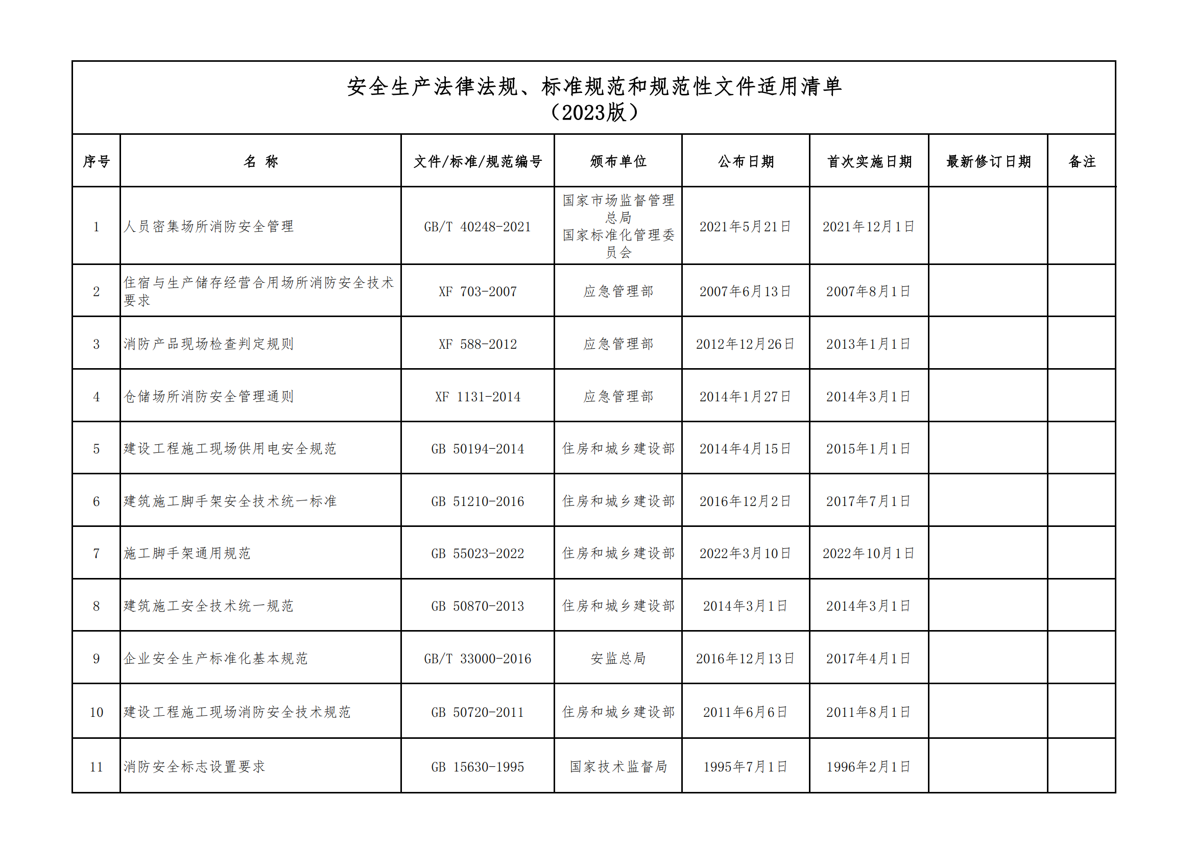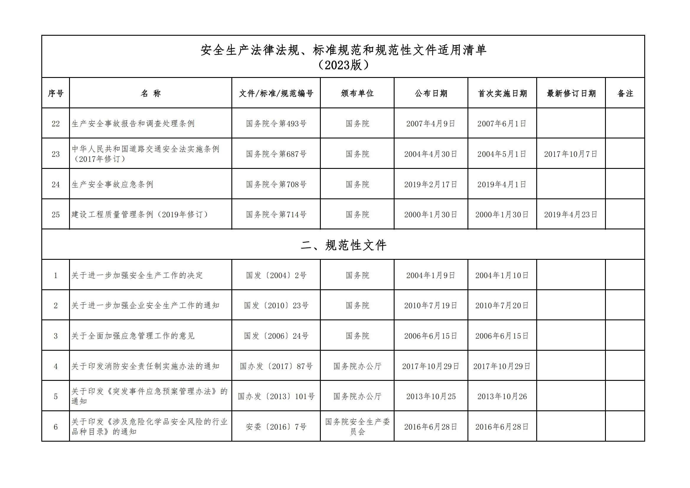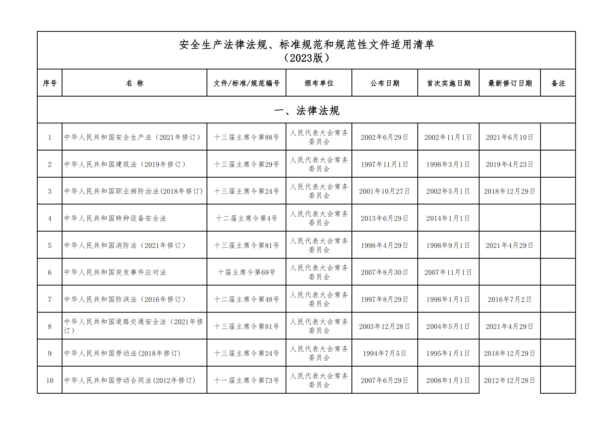 安全生產法律法規(guī)、標準規(guī)范和規(guī)范性文件適用清單